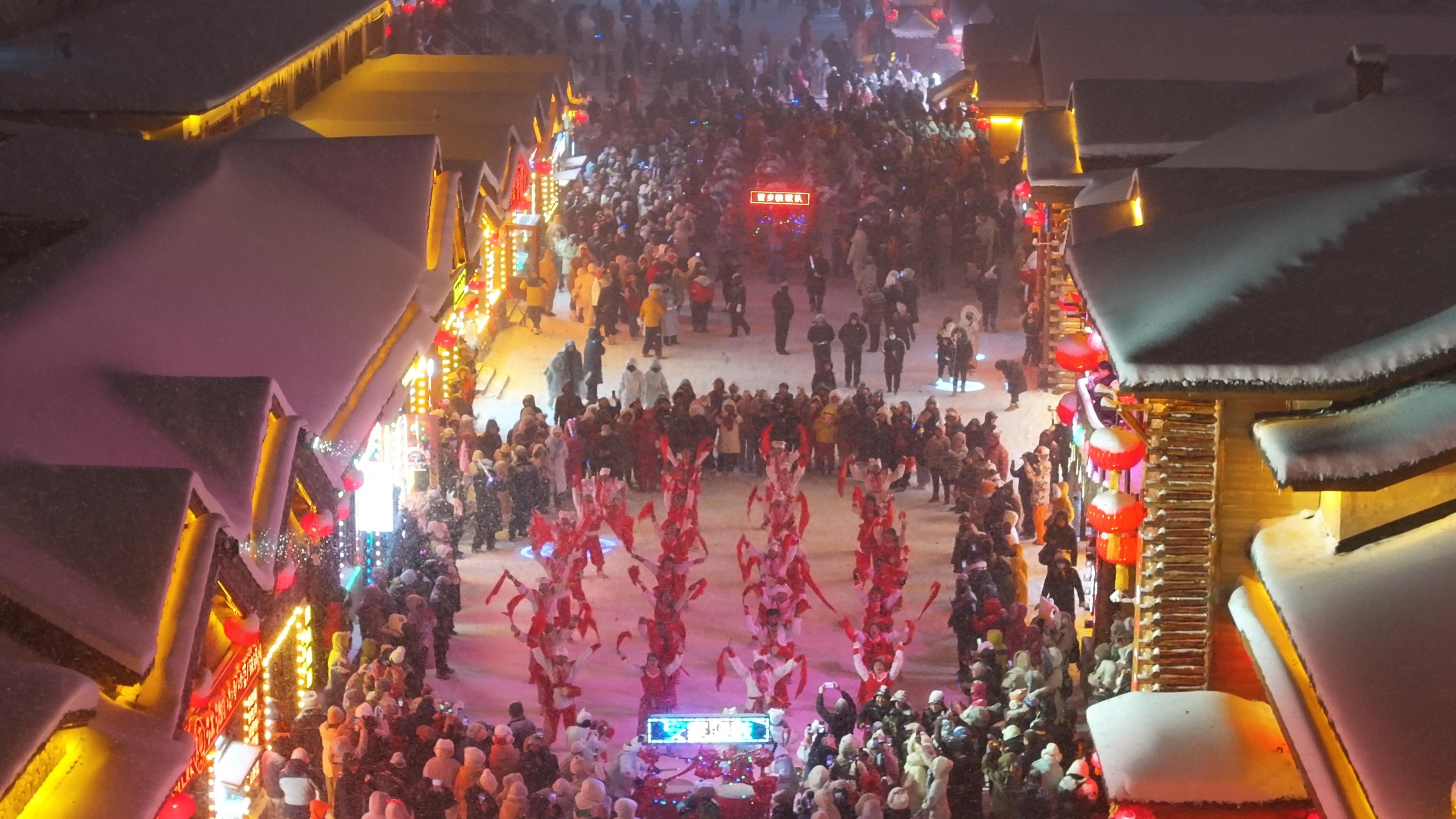 雪花灑,煙花畫,雪鄉(xiāng)冬夜盛裝迎客來。夜幕降臨,冰雪覆蓋的木屋村落與盞盞燈籠交相輝映,為游客打造了一場(chǎng)集視聽娛樂與文化體驗(yàn)于一體的冬夜盛宴。